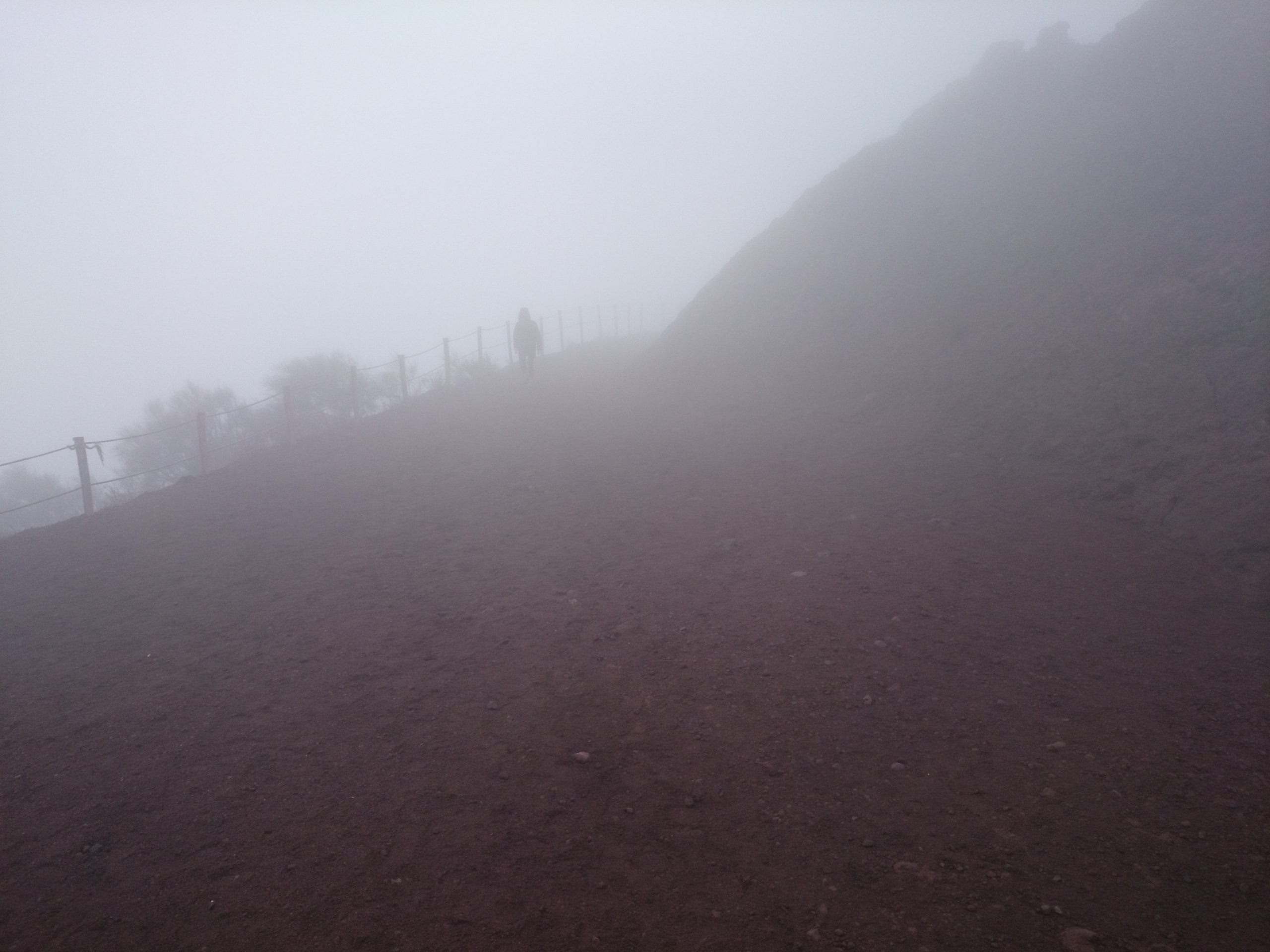 Vrchol byl zahalený do mlhy, viditelnost tak pět metrů a z půlkilometrového kráteru nebylo vidět ani ň. Zpočátku jsme si ještě odmítali přiznat, že bychom mohli mít takovou smůlu, a pobíhali sem a tam v zoufalé naději, že o kousek dál už vidět bude. Pochopitelně nebylo, a tak: byli na Vesuvu – ano; viděli Vesuv – ani náhodou! Je to hrozná škoda, těšili jsme se a teď vidíme akorát tak hovorově řečeno velký kulový.